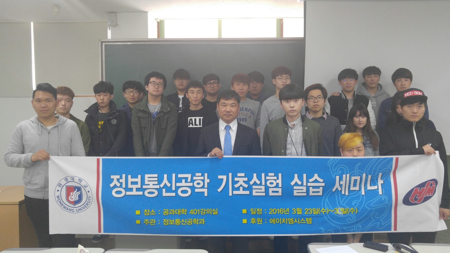 정보통신 기초실험 세미나 (2016년 3월 23일(수) 30일(수) 13:30-15:20, 장소 401 강의실) 에이치엠시스템(대표 김명윤)지원을 받아 2학년 재학생들에게 기초실험 실습을 위한 오실로스스코프등의 실험기기의 사용법및 보고서 작성법을 위한 2회에 걸쳐 세미나를 가졌습니다. 에이치엠시스템 김명윤대표님과 참여해주신 학생분들 모두 수고하셨습니다. 또한 세미나를 진행해주신 학과장 최우성 교수님과, 박대희 교수님께도 감사의 말을 전달해 드립니다. |