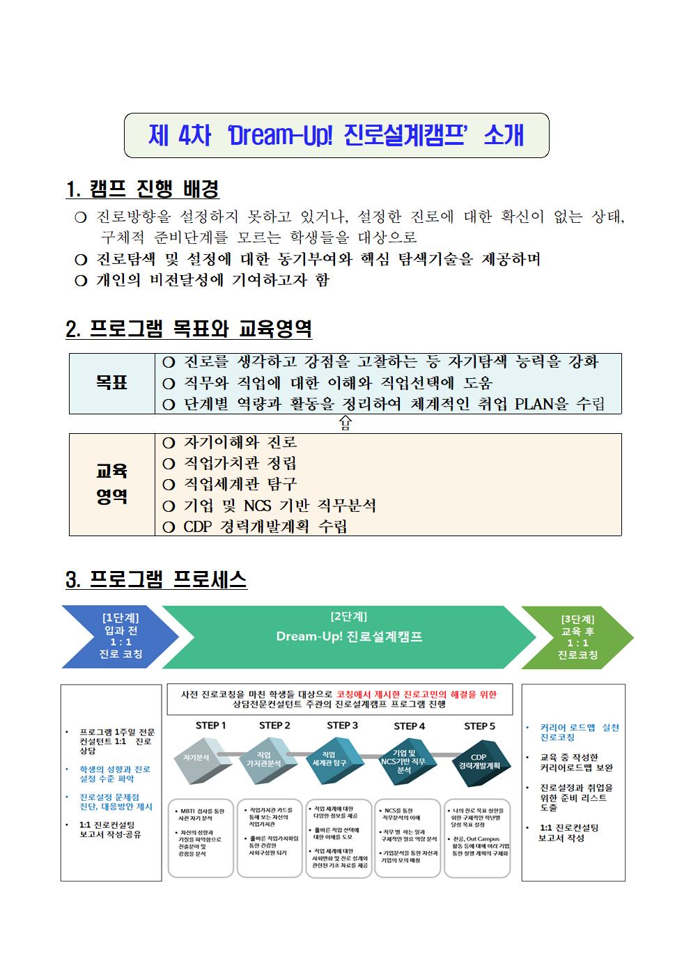 공지사항 홈커뮤니티공지사항 Dream-Up! 진로설계캠프 안내 Dream-Up! 진로설계캠프 안내 정보통신공학과2019-09-09 페이스북 트위터 구글플러스 이메일 프린트 인력개발처 주관하여 유첨과 같은 진로설계 캠프를 실시하니 정보통신 재학생들의 많은 참석을 바랍니다. 2019학년도 제 4차 Dream-Up! 진로설계캠프 참가신청서 양식 이전공지사항다음